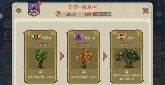四级以上的智慧树就能采集到树叶了,合成七级以上的智慧树时有几率产出雨林,我们的目标是至少刷出一个一级雨林。