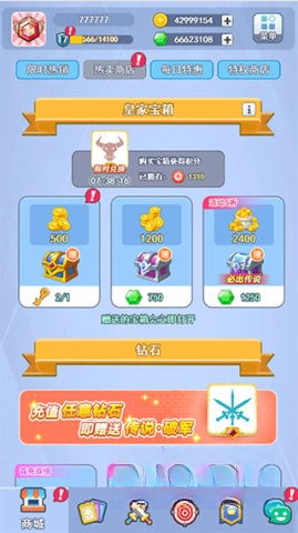 欢乐对决的商场处于界面的首栏位置,点开后能看到四个板块,分别是【限时热销】【热卖商店】【每日特惠】【特权商店】。在限时热销板块里,玩家能够买到一些特价的布洛克以及升级材料;热卖商店则是用于购买皇家宝箱、钻石和金币的场所。对于想要每天都能享受到特价商品的玩家,要记得前往每日特惠板块;特权商店提供的购买选项有月卡、大月卡、段位成长特权以及赛季特权。