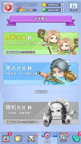 竞技模式处于第四栏,和对战、合作模式有所不同,这里的玩法更加新颖,涵盖随机镜像、单人竞技、随机竞技等类型。当满足特定条件时,玩家就能领取到宝箱、金币、钻石之类的奖励。