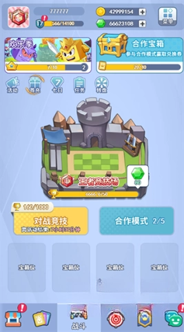 战斗界面是游戏的主界面,处于第三栏的位置。由上至下浏览,能看到玩家ID与头像、钻石和金币的数量、菜单、黄金令牌、合作宝箱、活动及任务栏、王者竞技场、对战竞技、合作模式,还有宝箱位置等内容。菜单栏里有签到、公告、排行榜、战斗记录、设置、个人反馈、宝典、信箱和兑换码这些选项,宝典功能能够协助你更深入地认识游戏模式、怪物、布洛克以及其他相关信息。