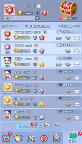 好友功能位于第六栏,这里从上到下依次展示着玩家的ID与头像、奖杯数量、当前状态、友情宝箱、好友列表,还有好友管理以及一键赠送和领取友情点的功能。当友情点累积到40点时,就能领取友情宝箱,此外,你也可以借助好友状态栏,和好友畅快地聊天互动。