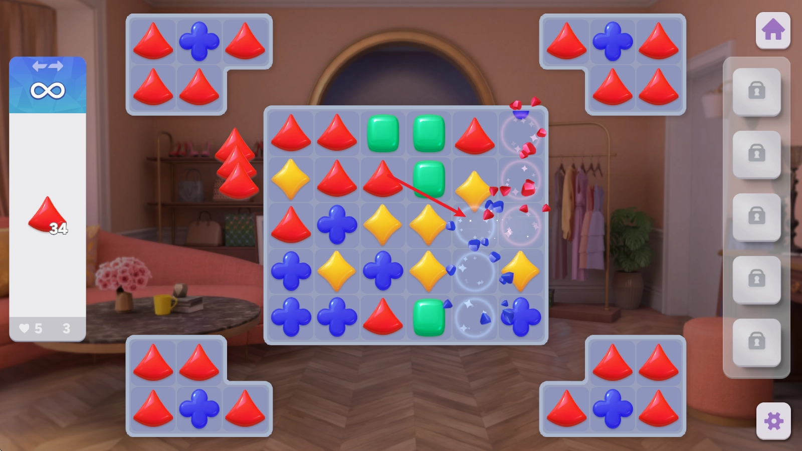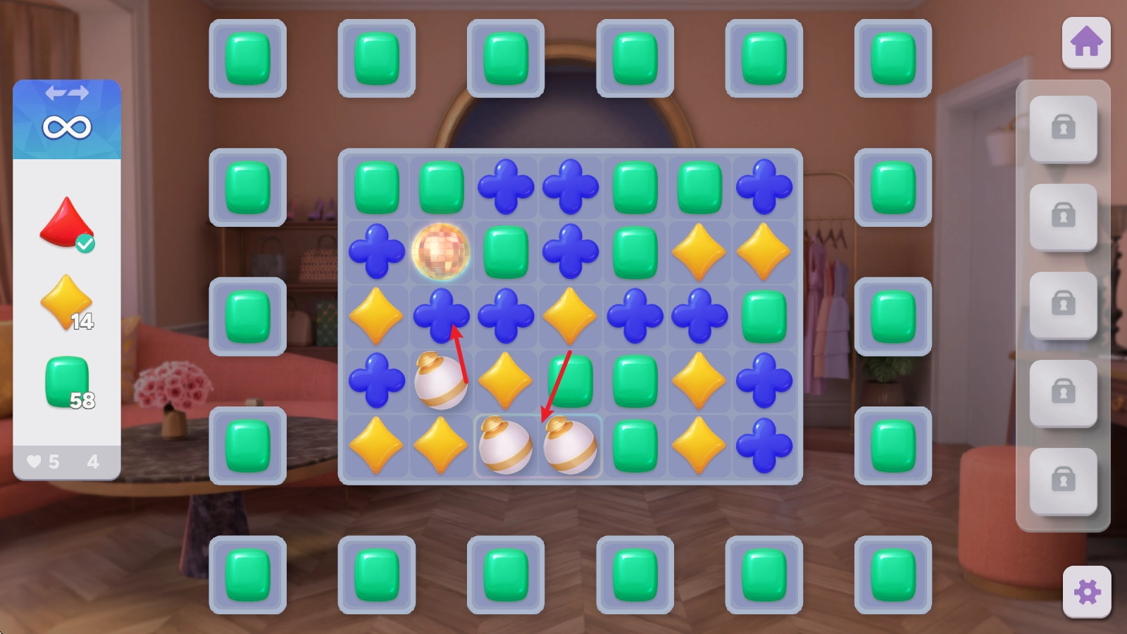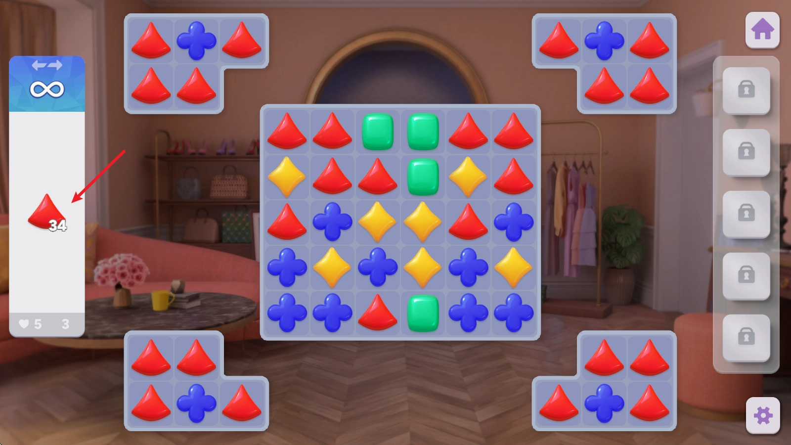 进入游戏后,首先要通过有趣的三消关卡来获取金币,进入关卡后就能看到每一关的消除要求。
