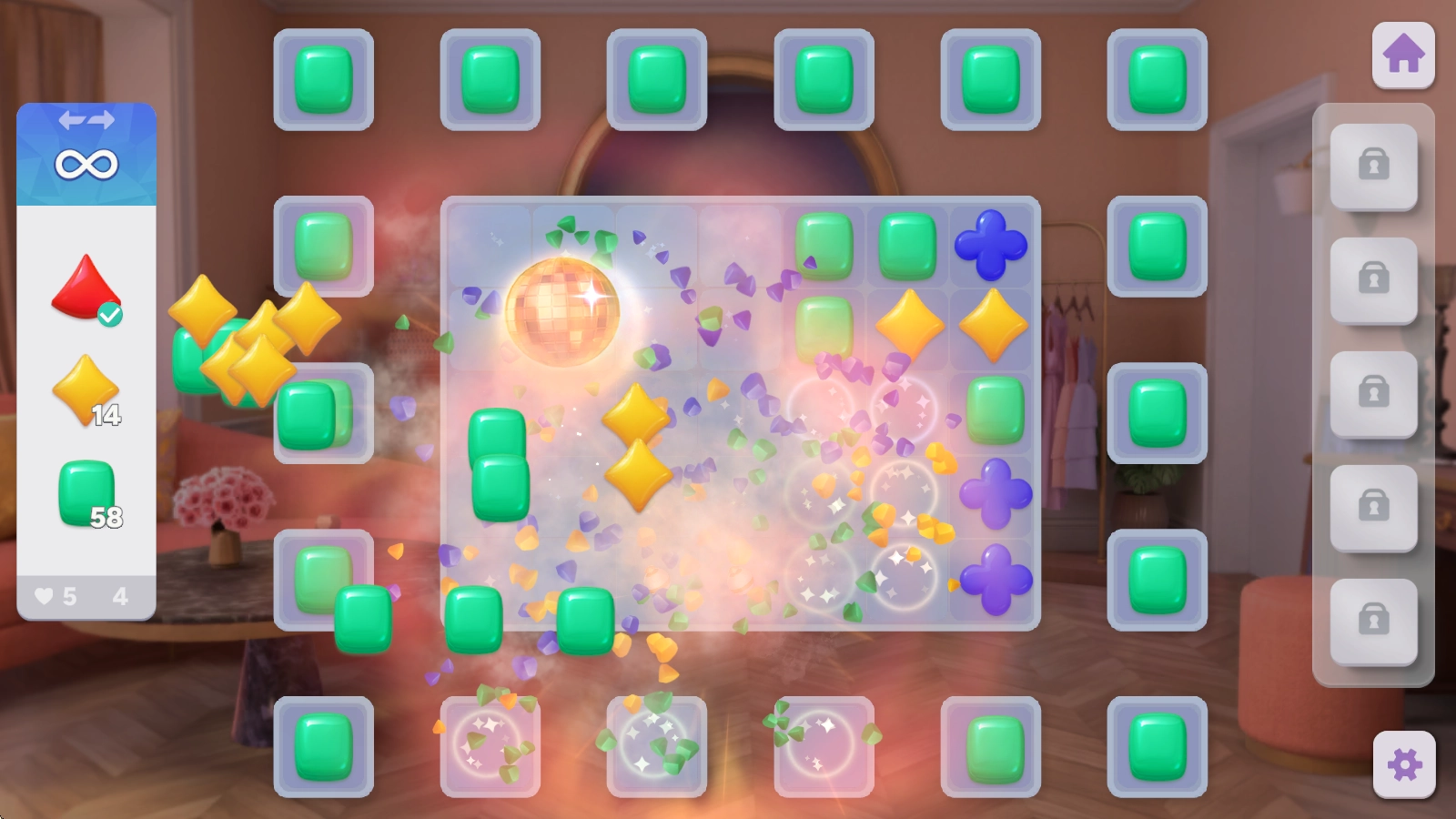 消除四个及以上方块就能获得特殊道具,既可以直接点击释放,也能通过与相邻方块交换位置后再释放。