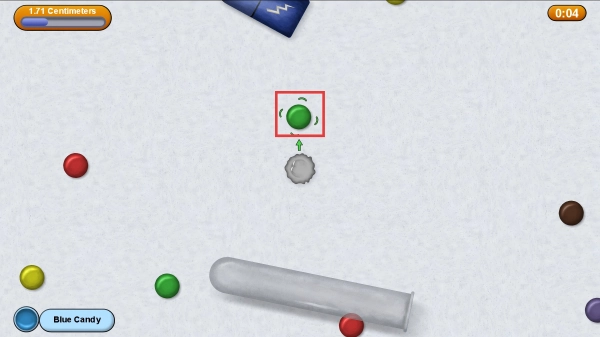1. 开启游戏后,通过滑动屏幕来操控绿色小球。你要做的是让这个小球吞噬诸如彩色糖果之类,那些比它体积小的周边物体,如此一来,小球便能持续成长,变得越来越大。