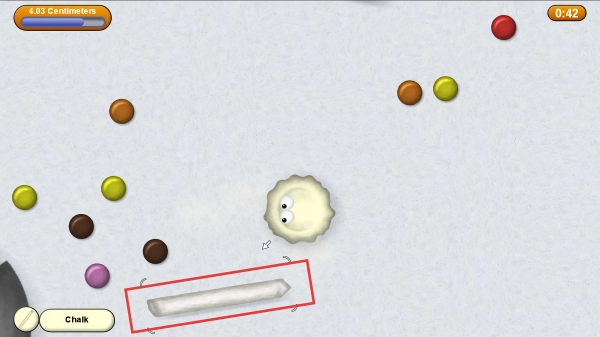 2、当小球变大之后,就可以吞噬粉笔咯。接着在场景中寻找那些可以被吞噬的小物件吧,不断让自己变得更强大呀。