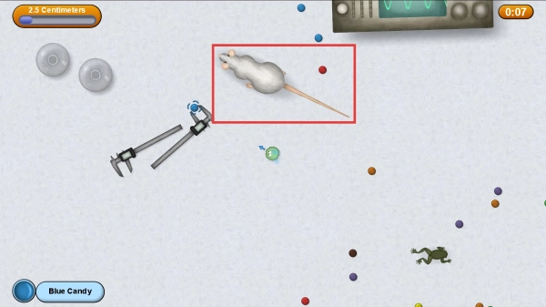 3、待自身足够大之后,就可以尝试挑战吞噬老鼠这类更大的目标啦。在此过程中,一定要留意躲避危险,一步一个脚印地让小球体积稳步增长。
