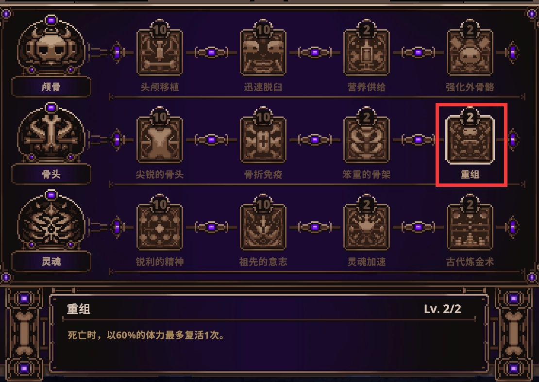 在魔王城里,我们能通过和魔女对话、消耗魔石来提升小骨的属性。而多次被敌人击败(成为敌人的经验值)后,也能攒下不少魔石——这里我建议先把“重组”技能点出来,这能帮助你在冒险中走得更远。