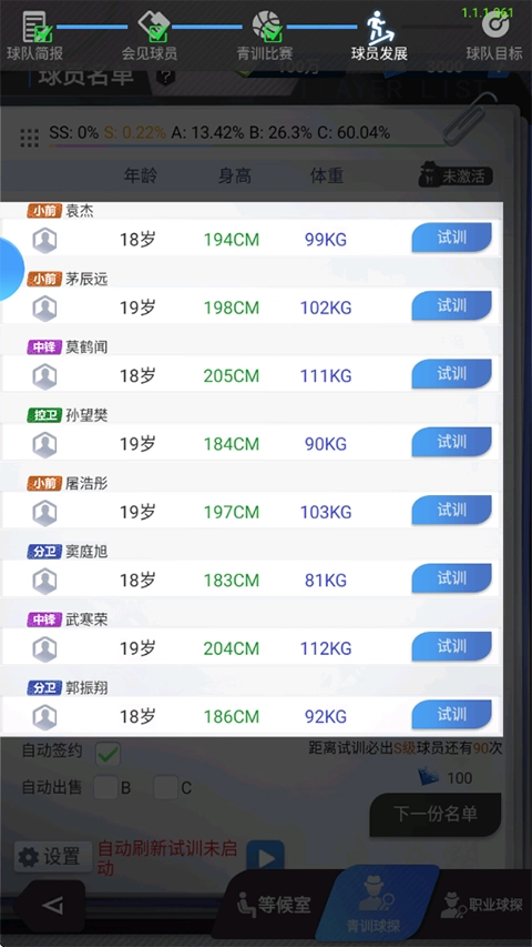 球员被划分为S、A、B、C四个等级,等级越高意味着潜力越大,所能达到的上限也就越高,年龄方面的情况也是如此。每次球探会提供8个等待试训的新人,每次只能从这些人里选择一个进行试训。球员名单第一次刷新是免费的,之后每次刷新需要消耗100钻石,试训一名球员则需要150钻石(如果开通了高级顾问服务,每次的费用最高可以享受8.5折优惠)。