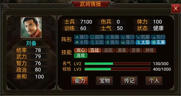 攻心:发动攻击时,可诱使部分敌方伤兵归顺我方。该技能效果会随发动武将的亲和值提升而增强,在亲和达到80、90、95、100时会有显著变化。需要注意的是,此技能对驻守在城关上的部队无法生效。