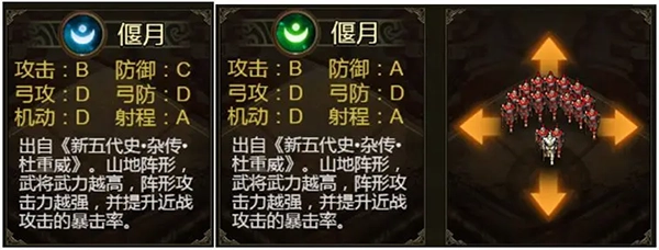 阵形:锥形阵(1阶)、偃月阵(1阶)、鹤翼阵(1阶)、鱼丽阵(1阶)