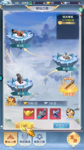在修仙之路中玩家可以挑战关卡,获得奖励;