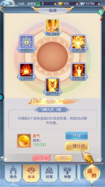 升级仙法,提升技能的伤害,点击一键升级即可。