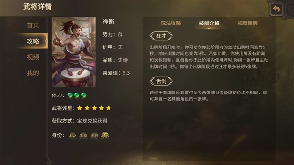 作为三国杀中经典的读条武将,祢衡一回合内就可以打出5张【杀】,而且没有距离限制,确确实非常适合反贼身份。在军八模式里,不管把祢衡放到几号位置上都不影响他对主公造成威胁,只要开局没有被秒掉,进入自己回合打完5张【杀】之后,主公没有被秒也是打残,剩下的交给队友,他的使命也就完成了。