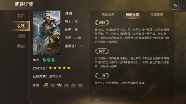 这个武将同样以高爆发能力闻名,既有多刀输出和无视攻击距离的特性,在过牌与控牌环节也表现不俗。许攸作为全能型的菜刀武将,若能熟练操作,在反贼阵营中能发挥重要作用,一回合内可对主公打出两三张【杀】,便于和队友协同集火。