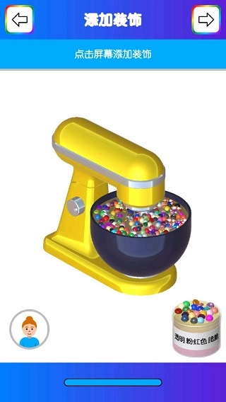 4、接下来,按照指引挑选粘液颜色并添加色素,接着从泡沫颗粒、小方块、水果片等装饰元素中选择一种或多种,以此完成粘液的造型。