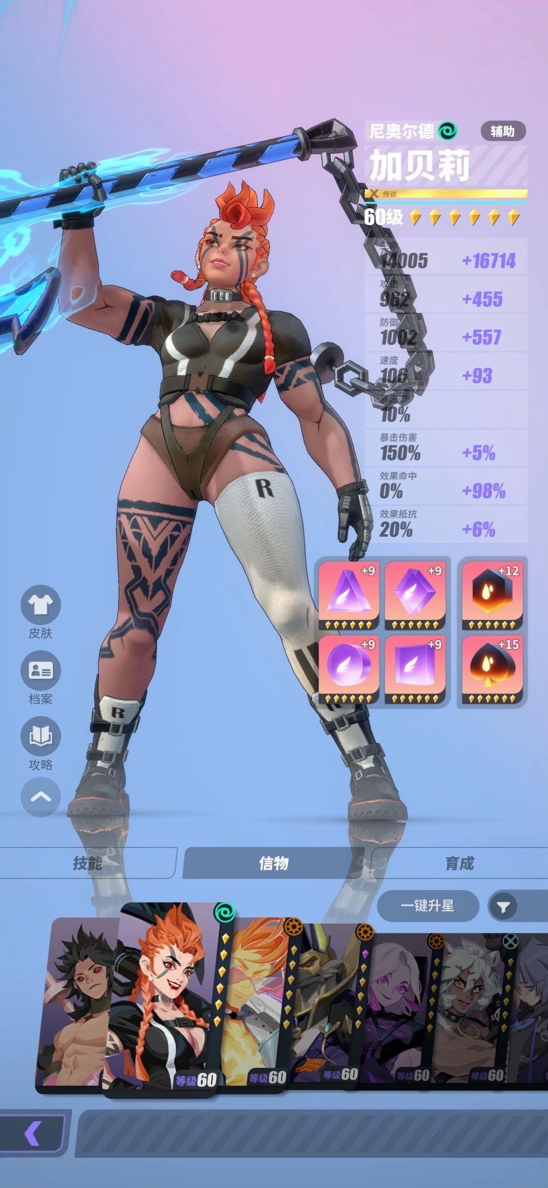 加贝莉的核心需求是确保技能命中,以此触发敌方减甲与降攻效果;速度属性需优先堆叠,剩余的装备词条则以生命为主。