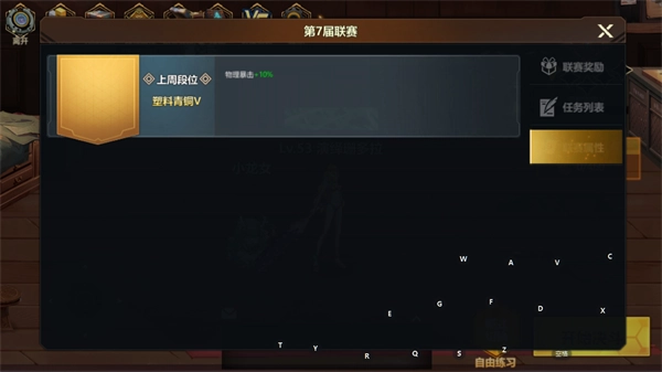 右上角显示的是当前的联赛段位,竞技场段位分为青铜、白银、黄金、铂金、钻石、王者六个等级。根据您上周结算时的段位,系统会为您提供一定的属性加成。