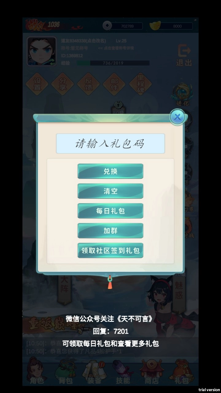 在游戏场景里点击礼包,就能进入礼包领取界面,输入礼包码后点击兑换,即可领取对应的奖励。