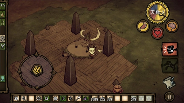 生命值、饥饿值与精神值初始状态均为满值。此时玩家无需过多操心,既不会遭遇天灾,也不会受到野狗和BOSS的侵扰。