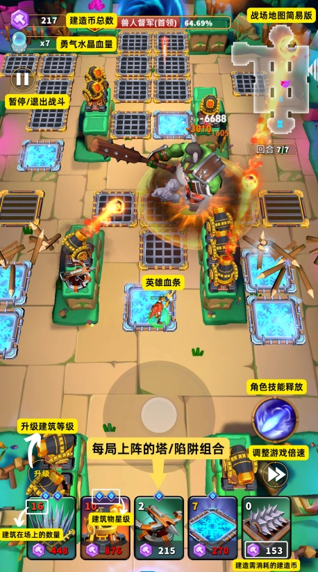 教程:为了帮助大家快速上戏,游戏在内设置了简单的教程关,教会大家英雄的基本操作和放置地面陷阱和高台塔,介绍游戏内的一些挑战模式/福利活动/家园玩法等等。