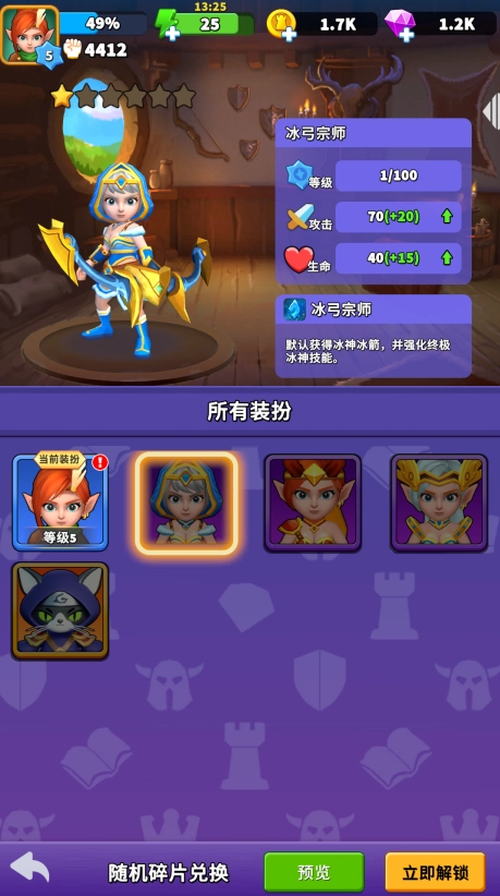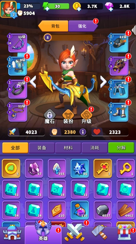 英雄:在这个界面中,你能够提升英雄的等级,学习新的技能,或者对英雄的装备进行替换与升级,除此之外,还可以解锁更多不同的英雄装扮。