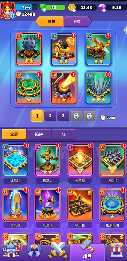 建造界面是游戏里的塔防建筑操作区域,在这里能给高台塔和地面陷阱做强化升级、提升星级,也可以更换当前上阵的塔防建筑搭配组合。