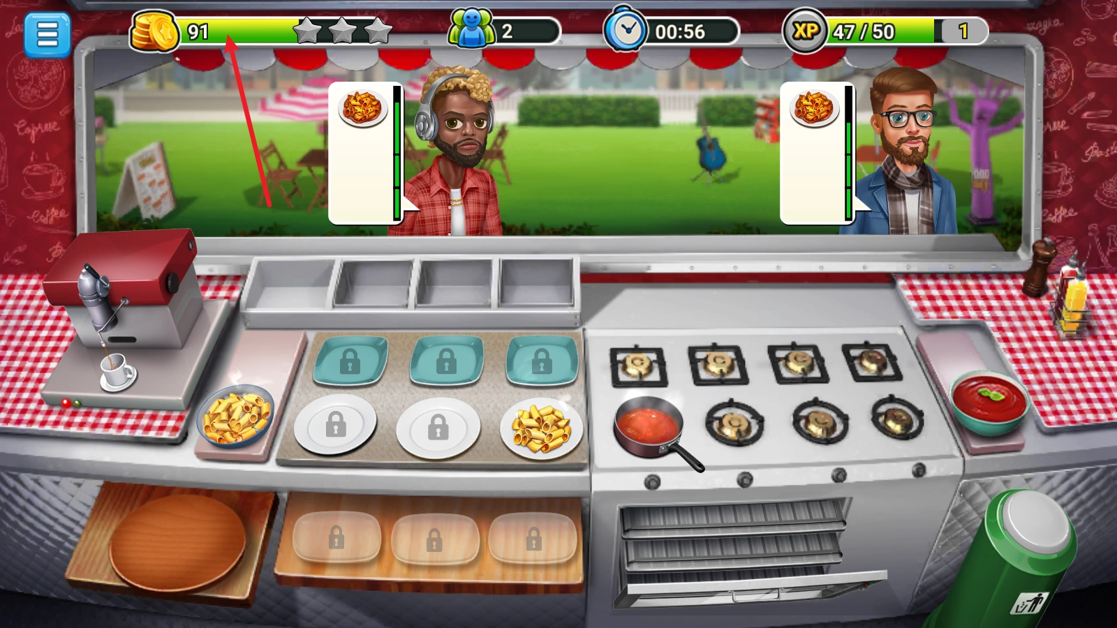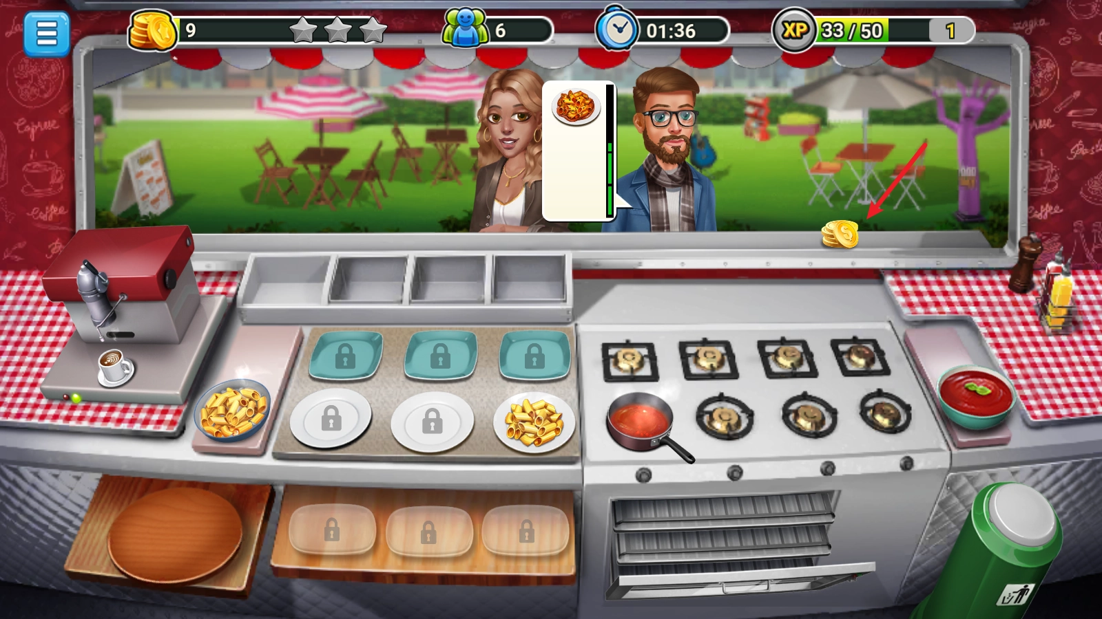 除了意面外,饮品会自动生成,同样需要拖动到客人身上来完成订单,完成后客人会留下金币。