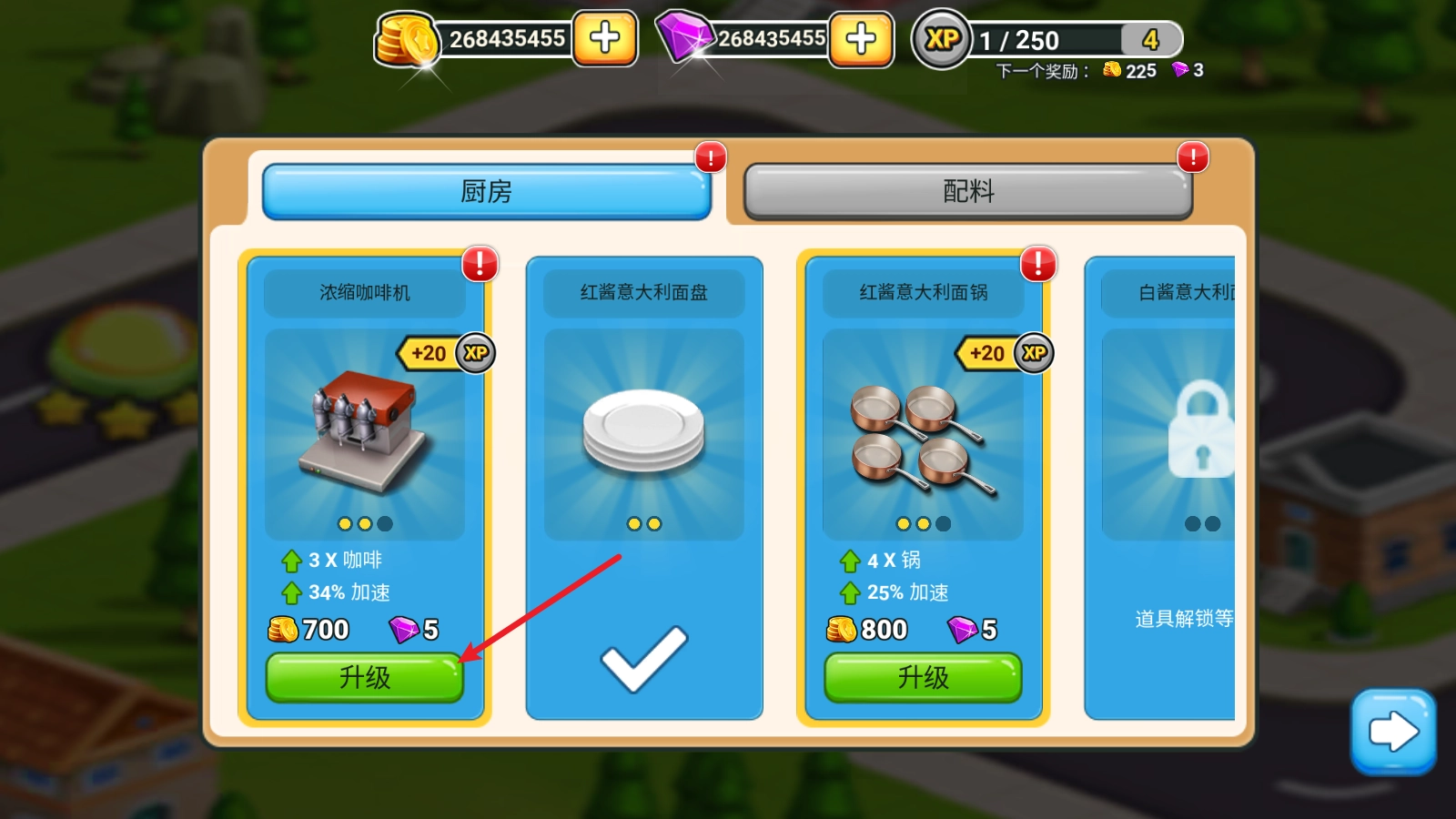 在这里挑选对应的厨具进行升级即可。