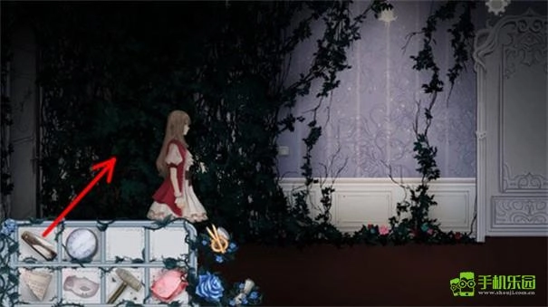 然后返回左侧的入口处,打开道具栏,选中匕首,接着点击墙上那片茂密的藤蔓,大约点击三次,就可以将藤蔓割开了。