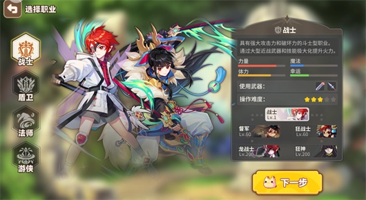战士:这是一个以强大攻击力与破坏力为核心特点的斗士型职业。他们凭借大型近战武器与各类技能,能够将自身的火力输出提升到极致。后续该职业可进行转职,方向为督军或狂战士,最终还能进一步升级为龙战士或狂神。