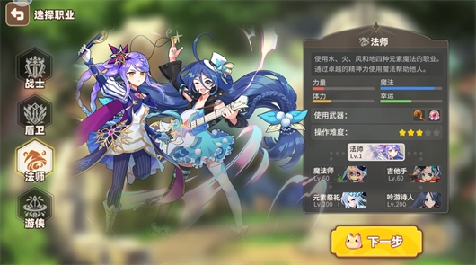 法师:这是一个能运用水、火、风、地四种元素魔法的职业。凭借超凡的精神力施展魔法来协助他人。后续可以转职为魔法师或吉他手,最终可进阶为元素祭祀或吟游诗人。