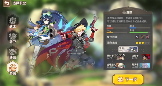 游侠:热爱战斗与冒险,是自带幸运光环的职业。能自由选择近战或远程攻击方向发展,后续可转职为神射手或火枪手,最终进阶为追魂猎人或裁决者。