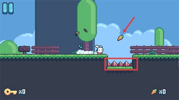 在关卡场景里,碰到【尖刺】陷阱时【点击屏幕】让兔子跳跃避开陷阱,同时收集【胡萝卜】道具。