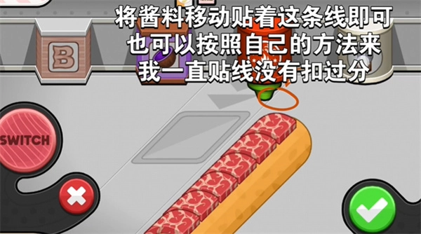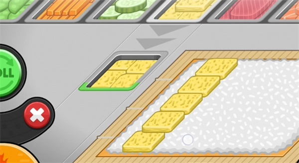 切寿司时遵循绿色辅助线操作即可,若未购买专用道具,也能依照桌面上的辅助线来切,尽量一次性切完为好。