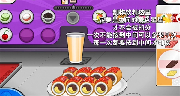制作饮料时,必须按到中间的黄色星星才不会被扣分。要是一次没按准中间,可以多尝试几次,但每次操作都得精准按到中间才行。