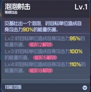 技能浅析:先看普通攻击,是向前发射水弹,能造成相当于自身90%攻击力的伤害,这个倍率属于正常水平,就不多做讲解了。