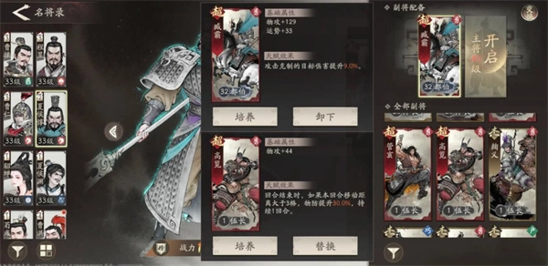 副将选择首推臧霸,能进一步提升夏侯惇的输出,还能略微增加暴击率,雪恨触发一圈暴击的场面相当亮眼,同时也能增强克制效果。等40级解锁2号副将后,就可以搭配高览了——夏侯惇的移动距离基本都会超过3格,而主属性为纯攻击、特技带加防的高览,刚好能进一步强化夏侯惇的续航能力。
