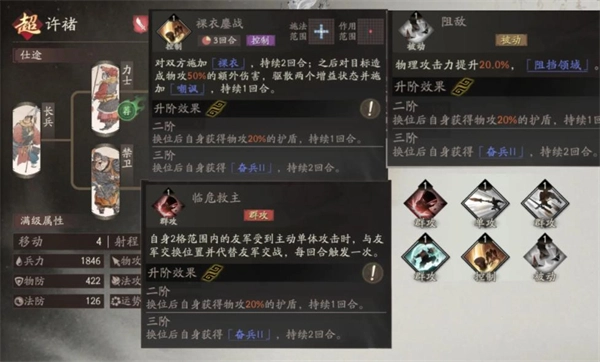 在分支选择上,许褚的两个分支都具备不错的强度。金刚线拥有高暴击特性,玩法类似狂战士;虎贲卫线则更偏向纯粹的坦克定位,玩家可结合自身其他主将的阵容来挑选,不同分支对应的技能选择也有所区别。输出能力较强的金刚线,适合应对单体BOSS的场景,其阻挡移动、换位技能搭配强制决斗的裸衣效果,单靠许褚一人就能牵制住BOSS,防止BOSS秒杀己方脆皮角色。坦度出色的虎贲卫线,则适用于敌人小兵数量较多的关卡,该分支除了法抗和运势略低于金刚线外,其余面板属性均更为优秀,不仅能快速切入战场并施展群体控制,还能顺带叠满被动效果。