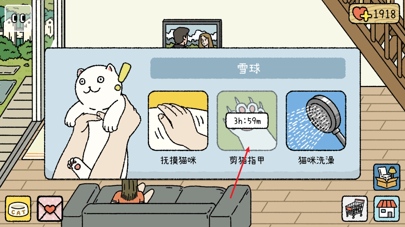点击猫咪,我们还能和它嬉戏互动,比如抚摸它、给它剪指甲之类的。