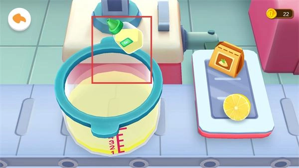 容器里已经有了加工好的液体,托盘上还放着柠檬道具,接下来要把这些道具加入容器,继续推进果汁的制作流程。