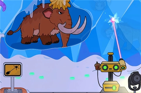 2、举个例子,小编在此处拖动激光,让冰块逐渐融化,之后就能看到长毛象和小企鹅啦。