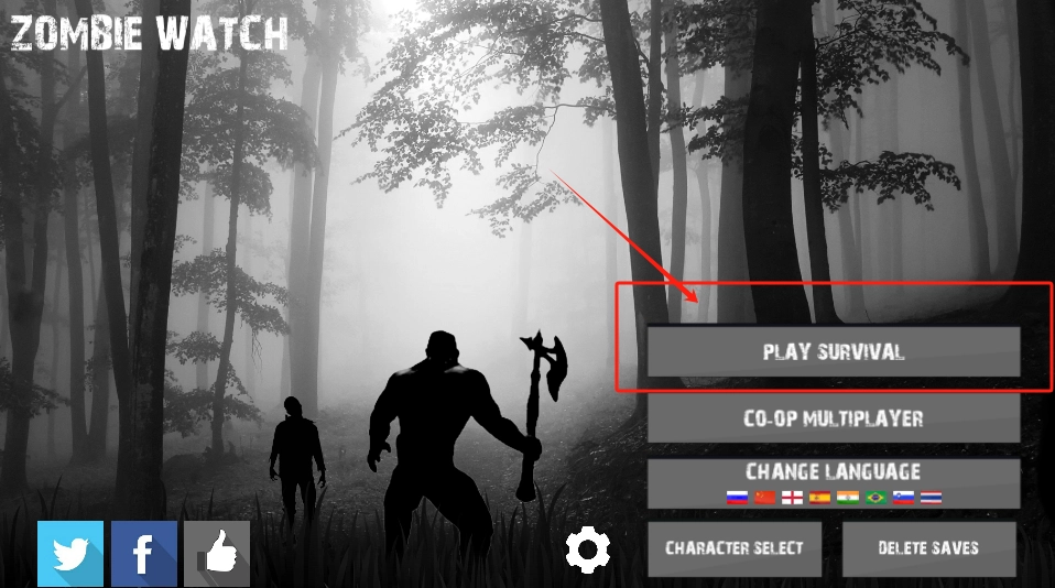 点击PLAY SURVIVAL即可进入生存模式,游戏界面的右下角支持语言设置和存档删除操作。