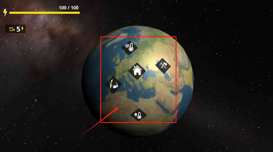 闪电图标显示电量为100/100,数字5代表金币,红框内是可供选择的地点。