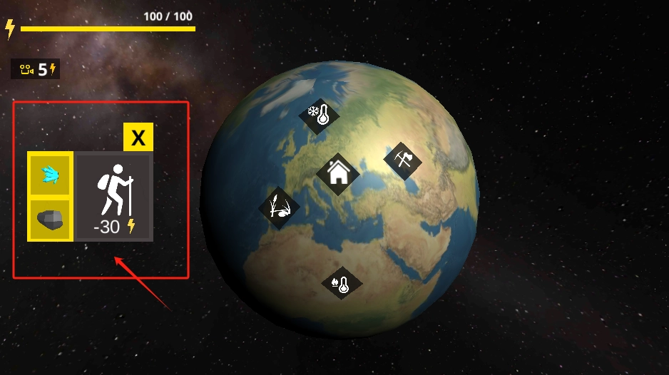 徒步图标会消耗30电量,左边显示的剩余电量为100/100,石头属于资源。