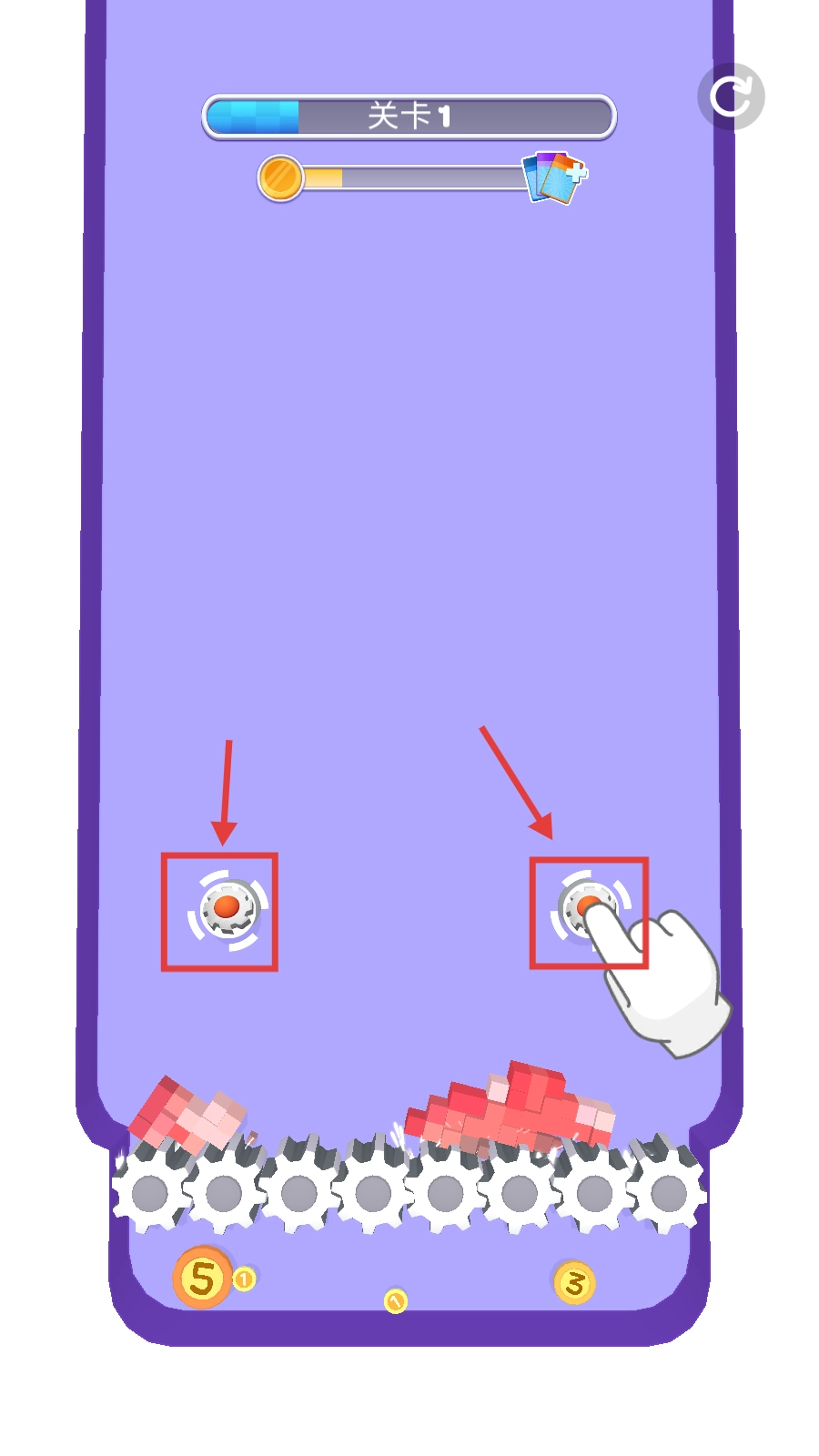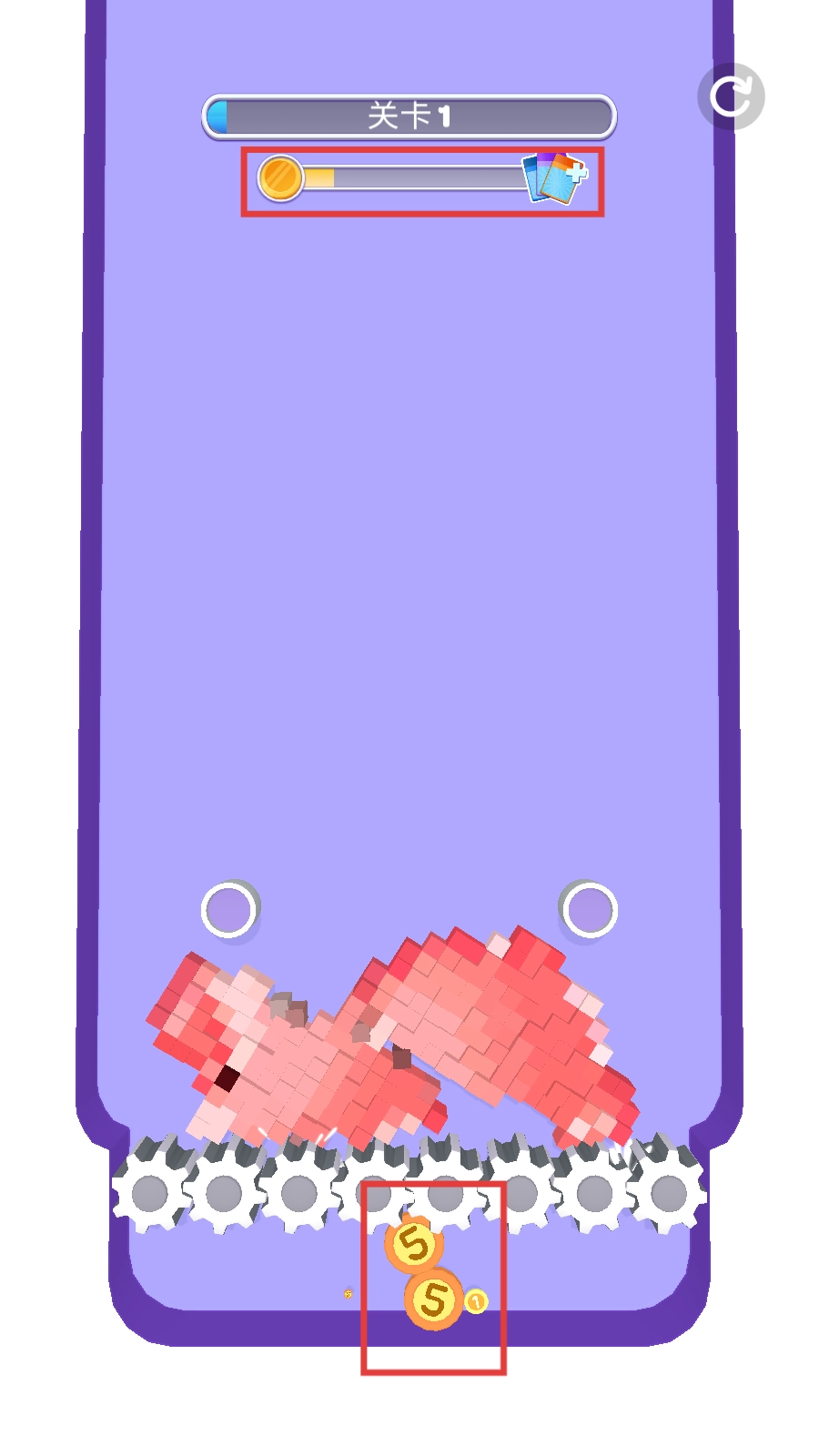 2、粉色像素块分裂为两半后,便顺势掉落至下方的齿轮位置,每当粉碎其中一部分,就能获取相应部分的金钱。