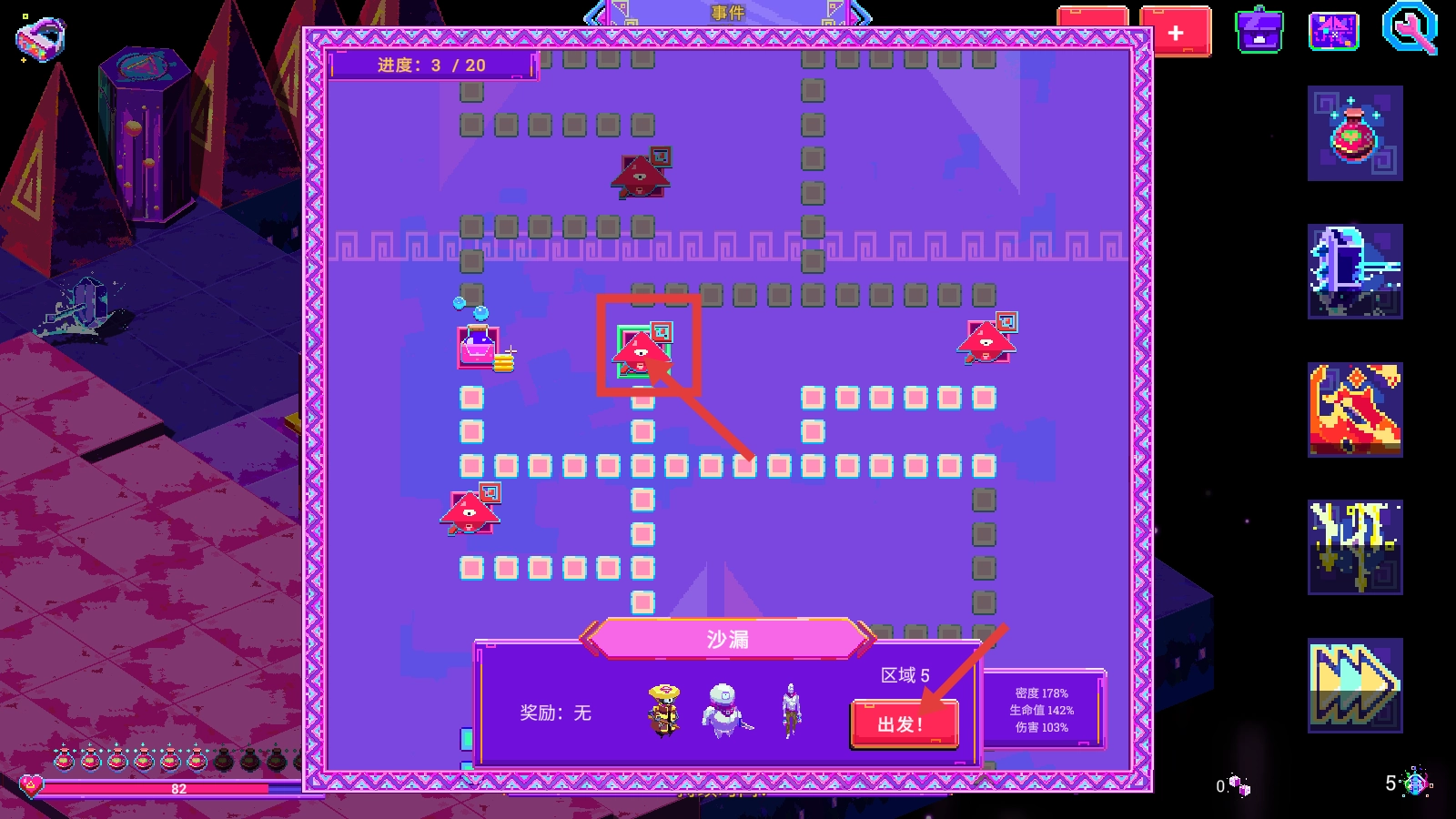 请留意【进度-3/20】,点击【沙漏-区域5】里的【出发!】按钮,开启区域探索并对付红色三角敌人。