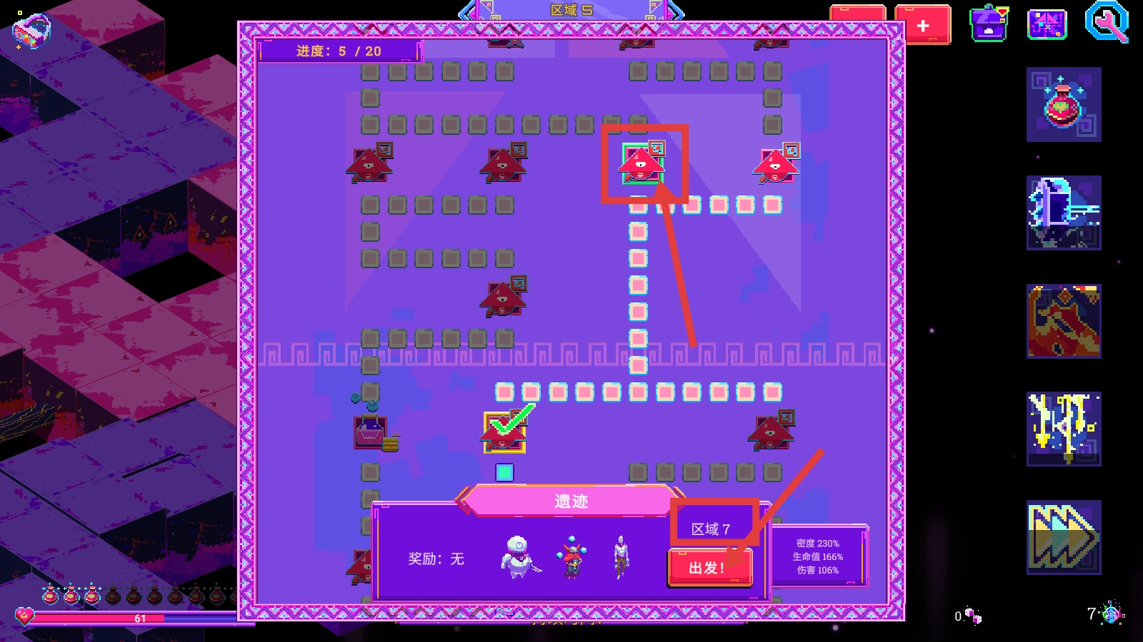 完成区域5的挑战后,点击【遗迹-区域7】中的【出发!】按钮,即可进入新区域开启挑战,继续推进整体进度。