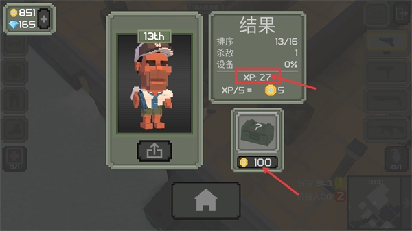 在结算界面查看【XP-27】等奖励,领取金币积累资源,点击主页按钮返回,为下一轮挑战做好准备。