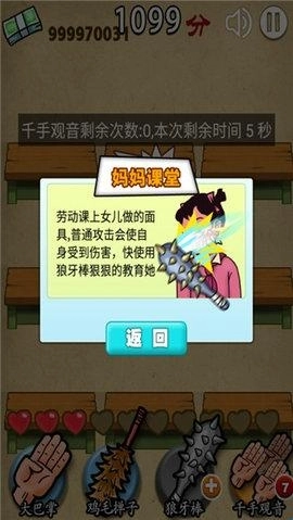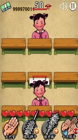 这款游戏采用经典的打地鼠机制,玩家需要点击随机出现的小朋友形象来积累分数并提升年级等级。不过需要注意的是,部分小朋友会携带特殊道具,可能带来意想不到的效果,所以行动前一定要仔细观察。此外,游戏中还加入了鸡毛掸子、狼牙棒、千手观音等特色道具技能,进一步增强了游戏的独特性和趣味性。