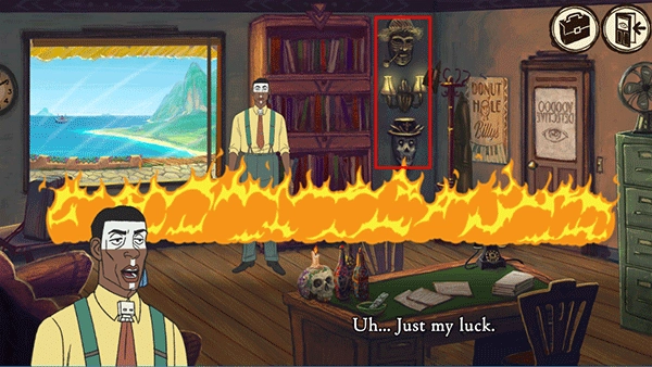 在游戏里遇到“Voodoo Detective”起火的场景时,记得保持镇定。要仔细检查墙上的两幅面具,保证把它们都查看一遍。